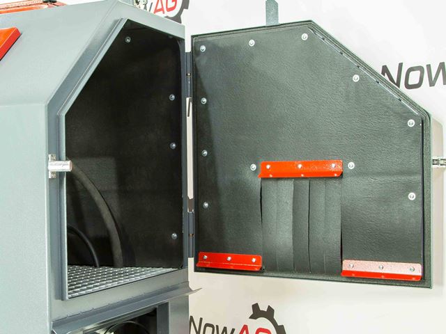 Абразивоструйные перчатки закреплены непосредственно на фронтальной поверхности камеры. Такая конструкция позволяет максимально защитить оператора от вылетающего абразива из камеры, а так же дополнительно герметизирует процесс работ.
