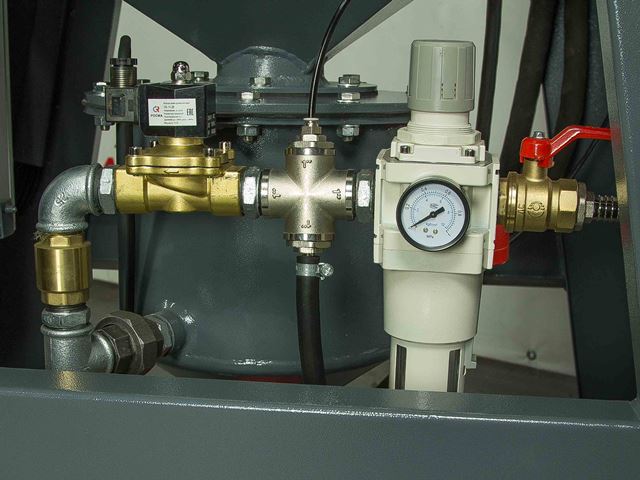 Герметизирующий конус-клапан автоматически запирает емкость и сжатый воздух начинает создавать давление внутри, способствуя подаче абразивного материала в дозатор абразива.